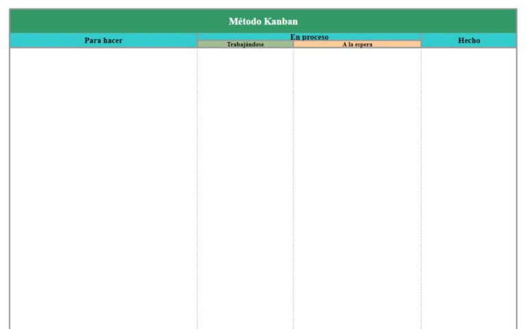 La primera hoja es la tabla del método Kanban, la cual podrás utilizar para colocar las tarjetas correspondientes a cada proceso de trabajo.